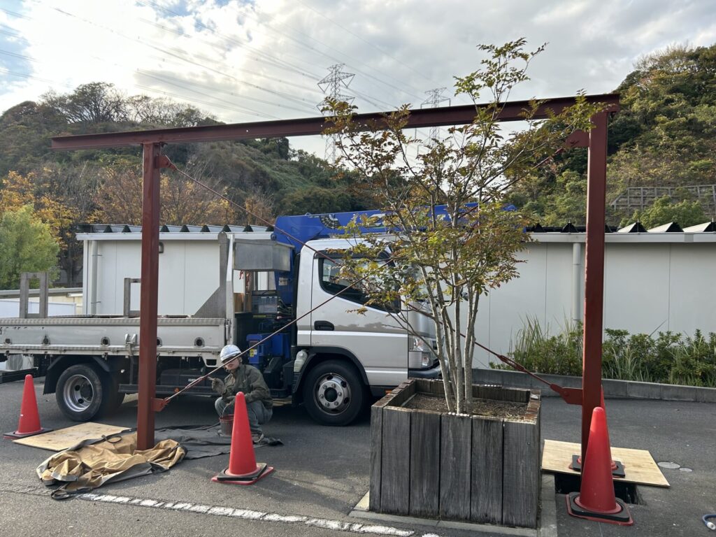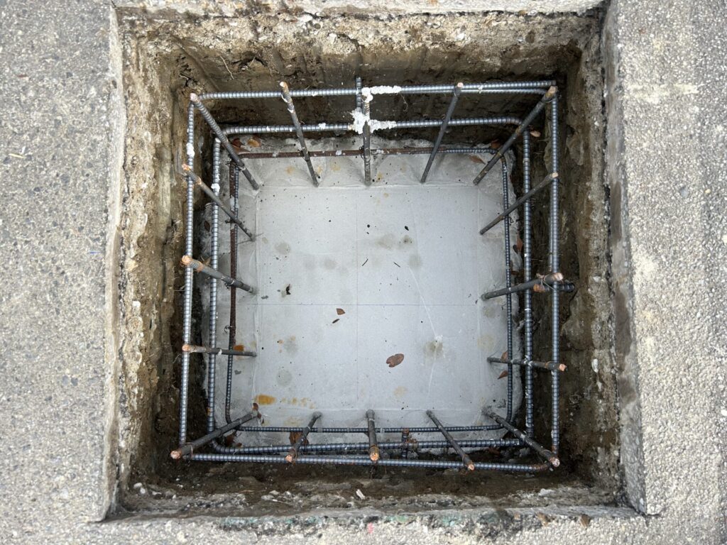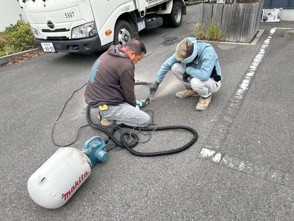 既存のアスファルトの駐車場に穴をあけてから支柱を建てます。