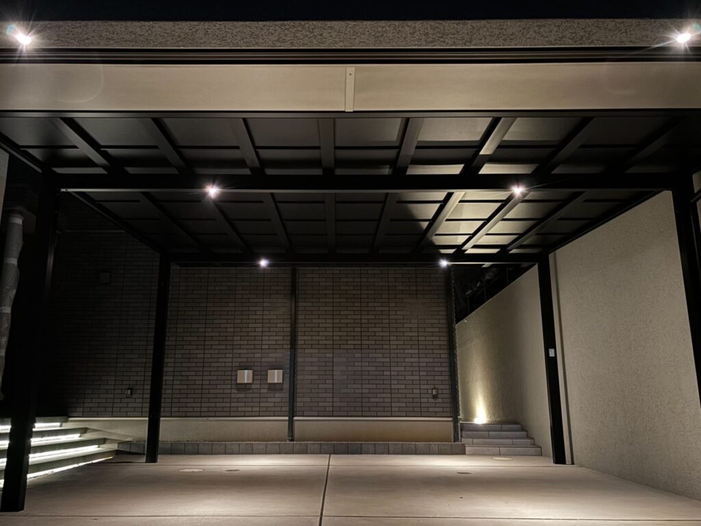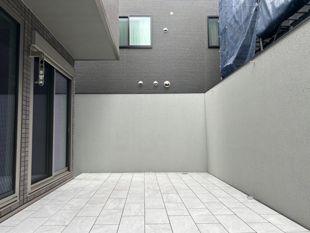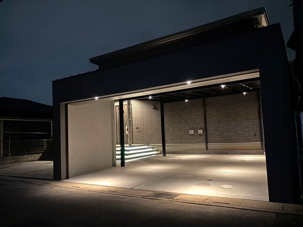 シャッターゲートから庭のタイルテラスまで、一体化した高さ3mの塀でプライベート空間を確保しました。洗礼されたシンプルなデザインと、贅沢な照明使いで高級感を演出。お客様にも大変喜んでいただけました。